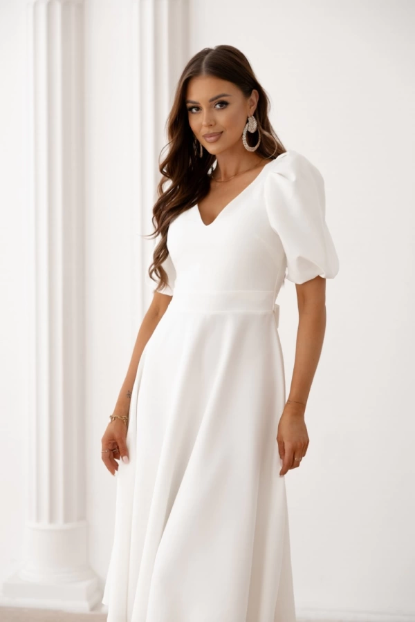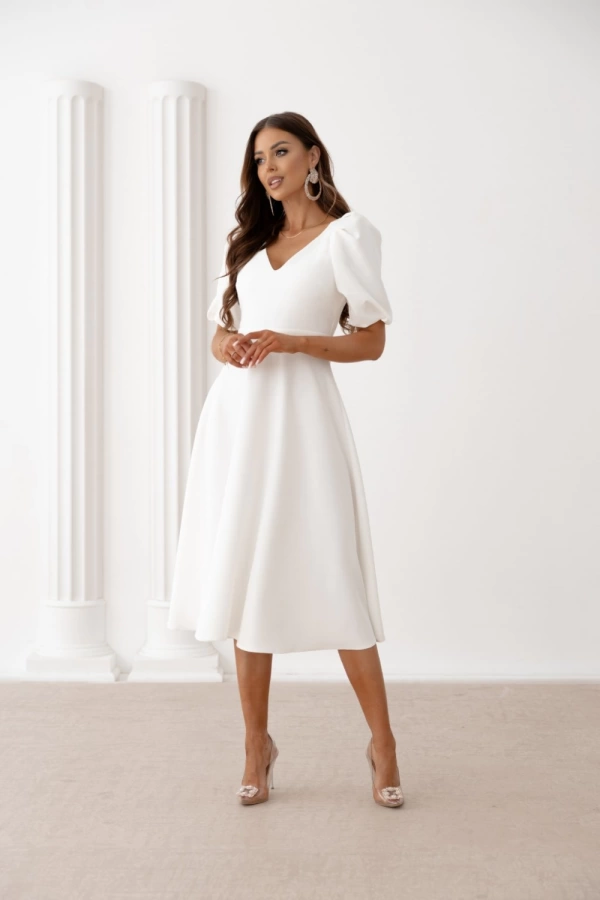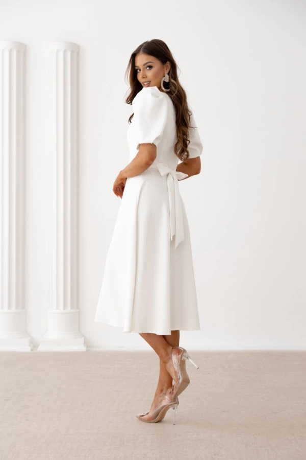 Белое элегантное платье миди с рукавами-воланами и бантом на спине