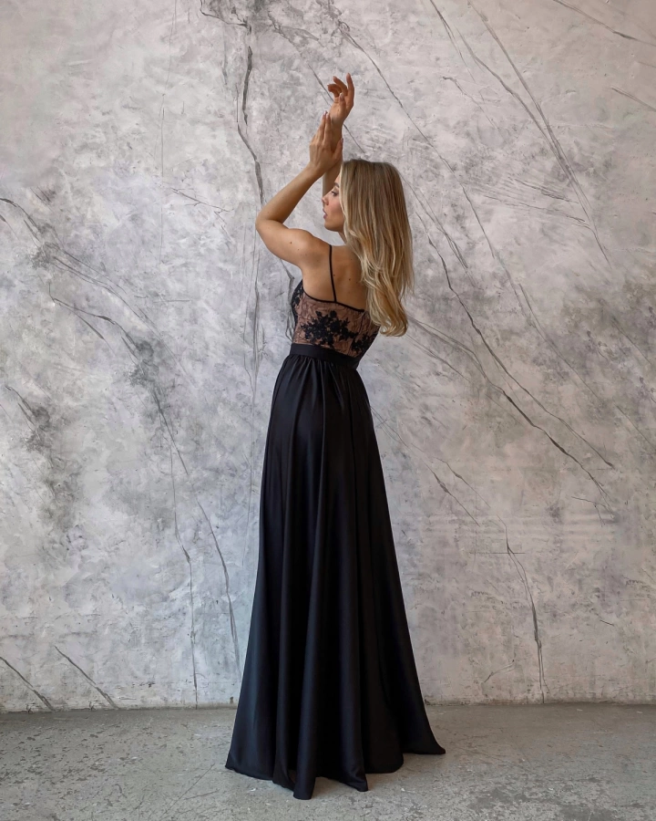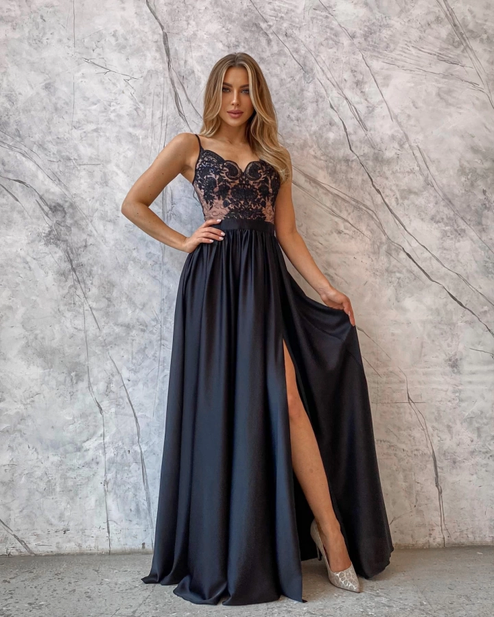 Это великолепное черное длинное вечернее платье с пышной юбкой и разрезом станет настоящим акцентом на любом торжественном мероприятии. Его изысканный дизайн, дополненный черным кружевом на бежевом фоне, создает эффектный контраст, который привлекает внимание и подчеркивает элегантность. Платье идеально подходит для вечерних приемов, свадеб, коктейльных вечеринок и других особых случаев, когда вы хотите выглядеть стильно и запоминающе.