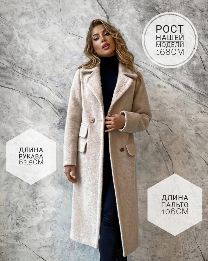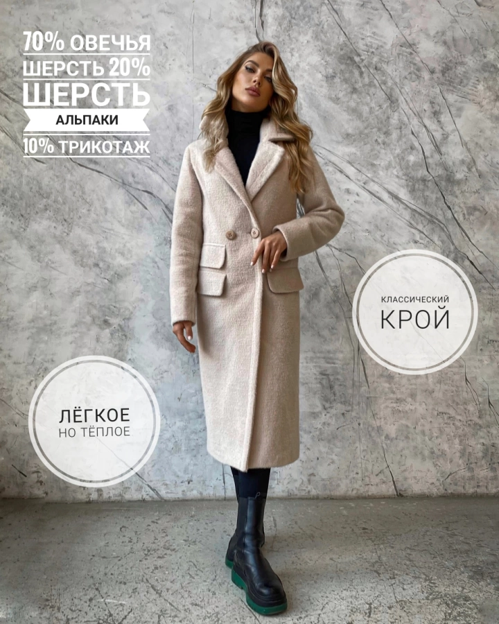 Изготовлено из натуральной шерсти, в т.ч. шерсти альпаки, с минимальным добавлением полиэстера (не более 10%) в трикотажных деталях. Теплое, с подкладом, обеспечит комфортное ношение до легких морозов.
