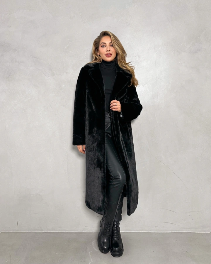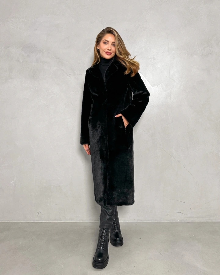 Эта длинная черная шуба из экомеха в стиле old money воплощает собой эталон безупречного вкуса и утонченности. Модель выполнена из высококачественного экомеха, практически неотличимого от натуральной черной норки — материал обладает благородным блеском и красиво переливается на свету. Классический однобортный крой и аккуратный стояче-отложной воротник создают лаконичный элегантный силуэт, который будет уместен как на светском мероприятии, так и в повседневной городской жизни.