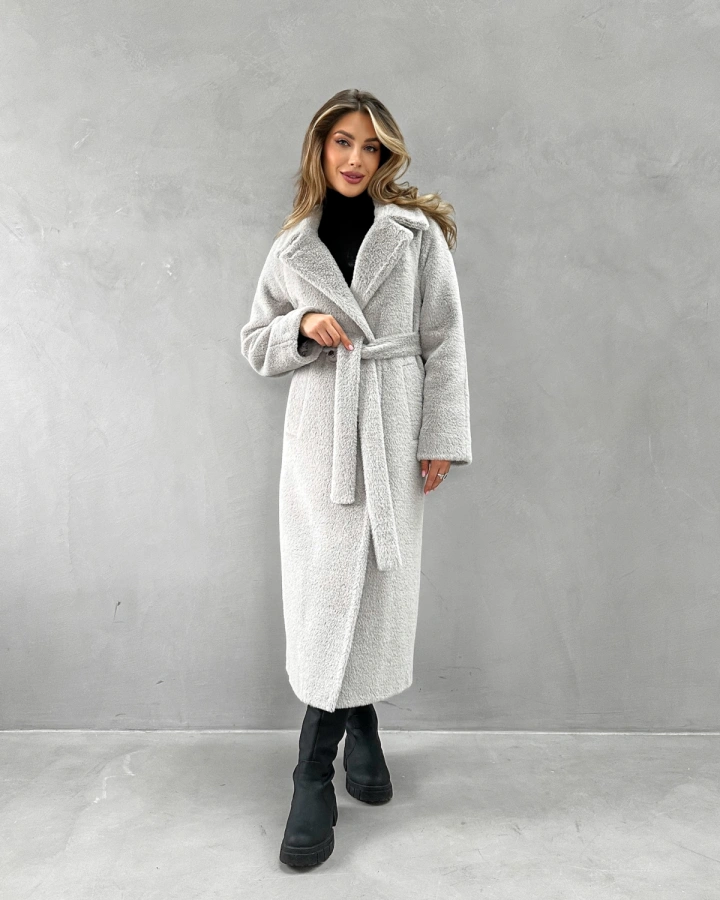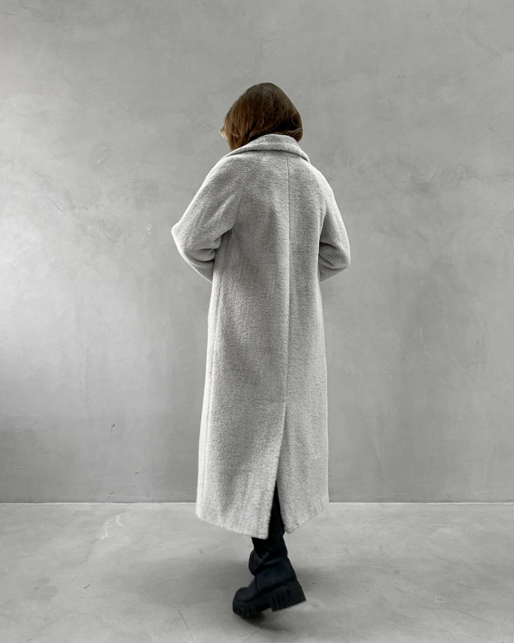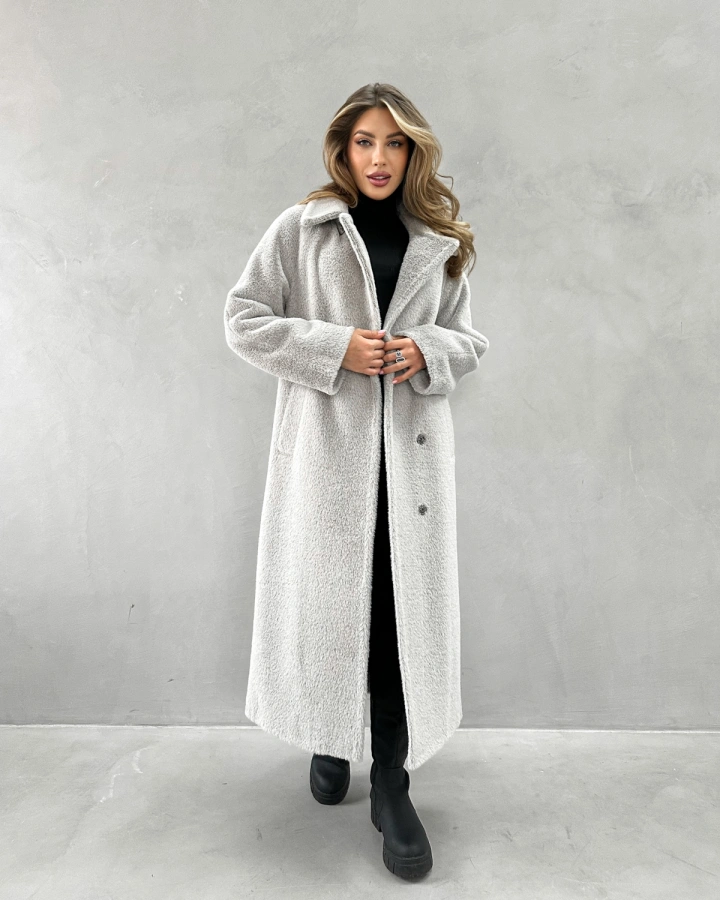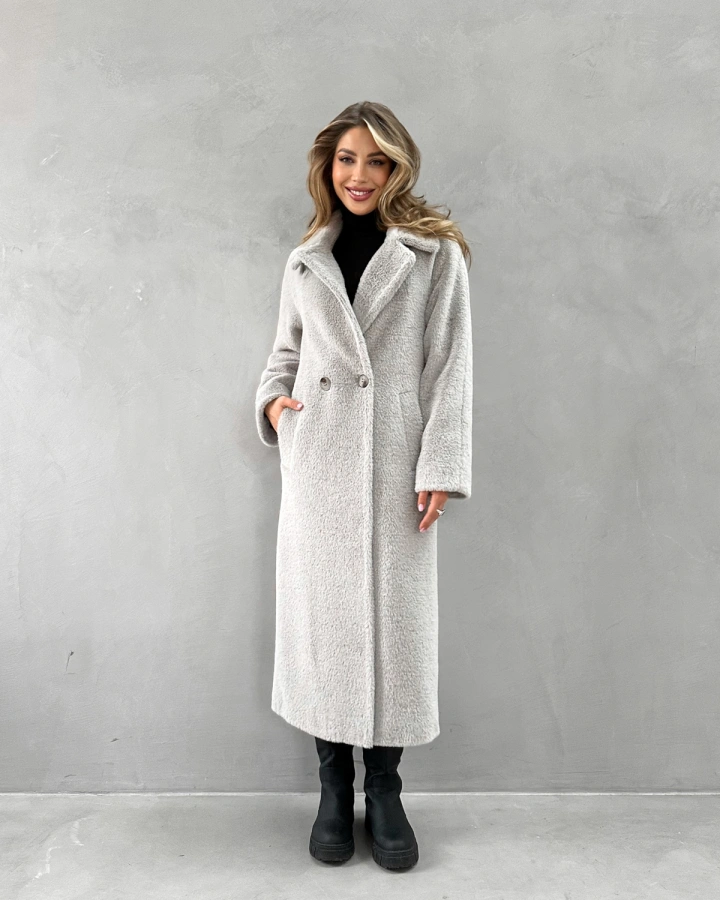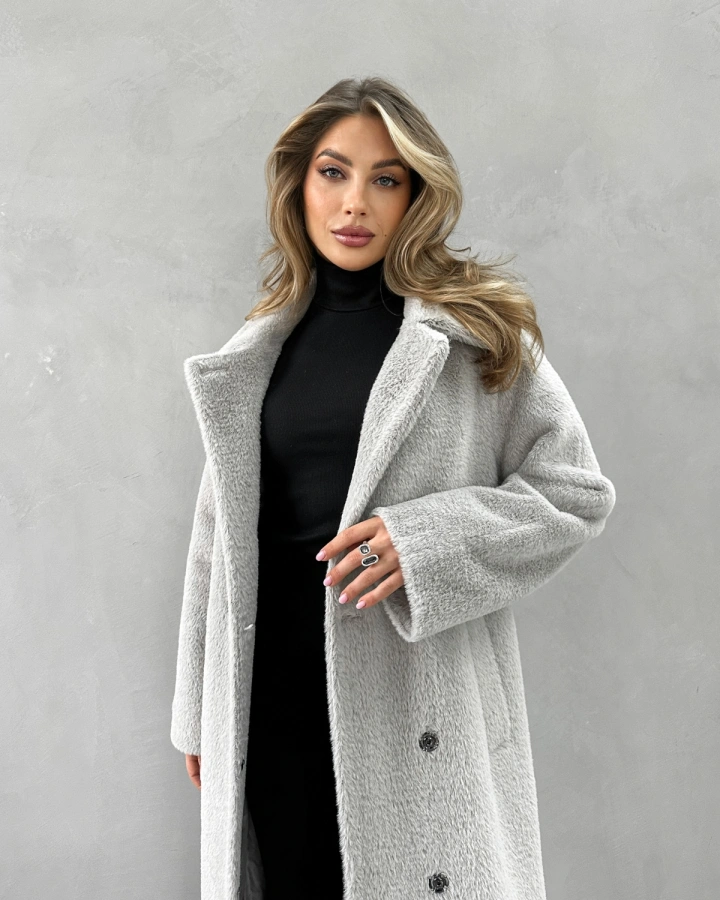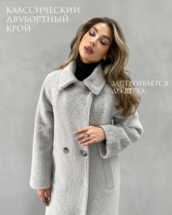 Длинное двубортное пальто из экомеха под норку светло-серое