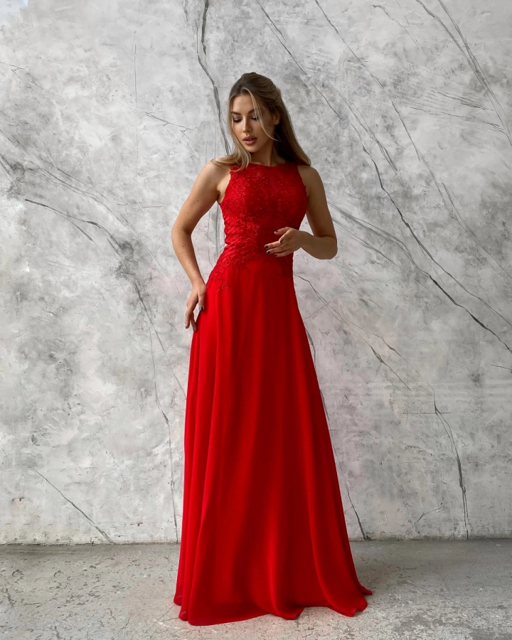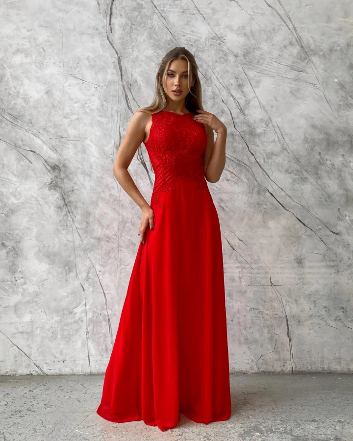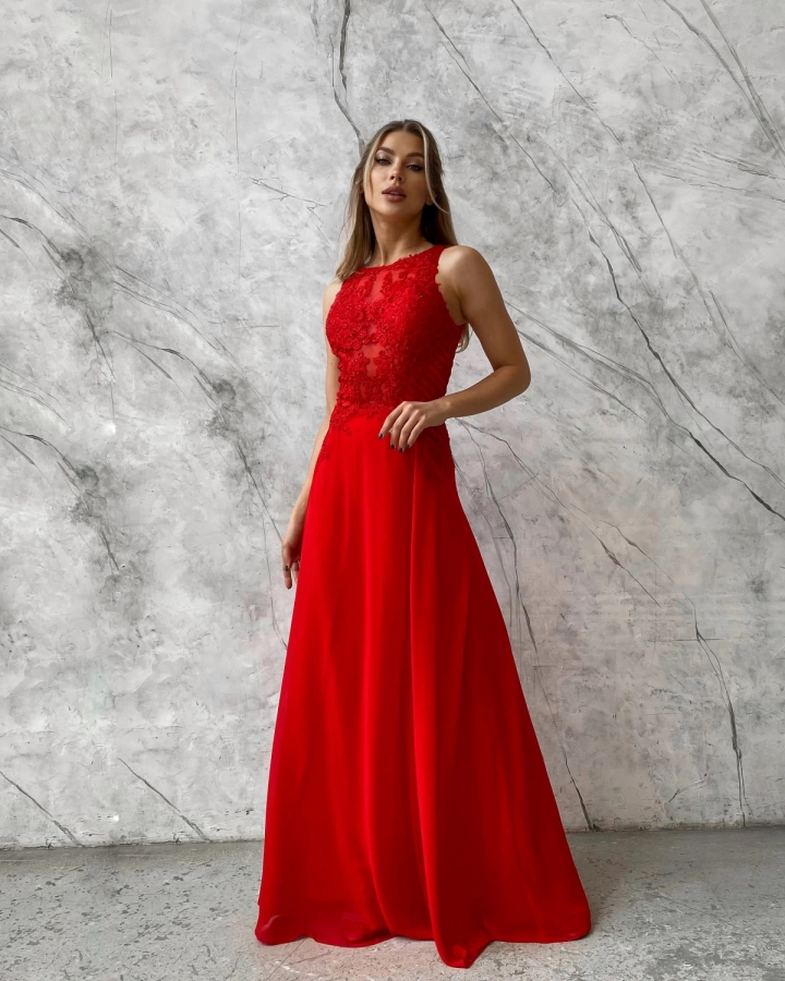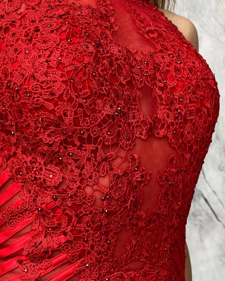 Длинное красное вечернее платье с кружевом и кристаллами — это воплощение роскоши и элегантности, идеально подходящее для торжественных мероприятий. Платье украшено кружевом и кристаллами, что придает ему особую изысканность и очарование.