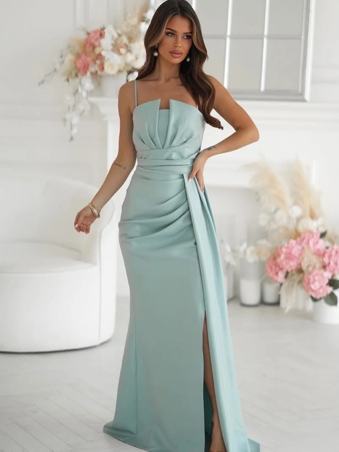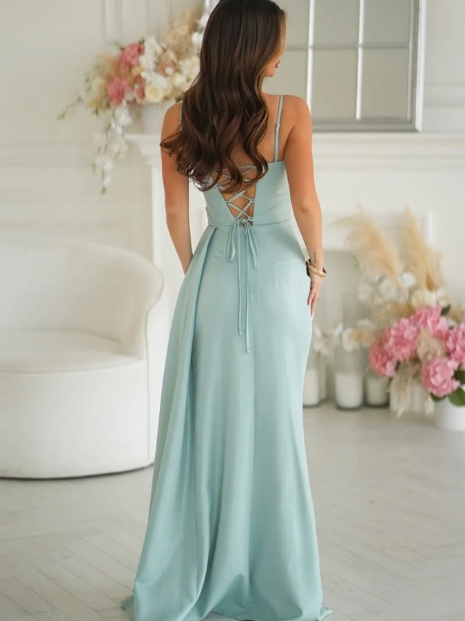 Длинное мятно-зеленое вечернее платье-футляр с регулируемыми бретельками и шнуровкой на спине — тренд 2026