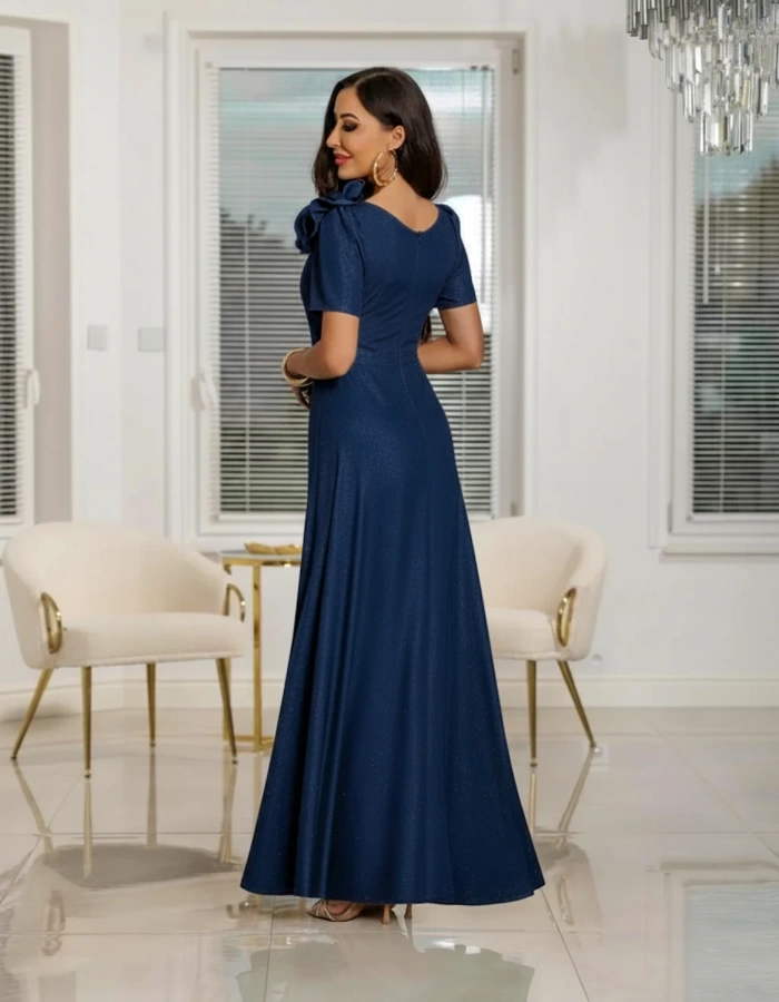 Вечерний наряд в благородном темно-синем оттенке для торжественных случаев. Модель с расклешенной юбкой и изящным цветочным акцентом создает гармоничный образ, сочетающий современную элегантность и романтическую ноту.