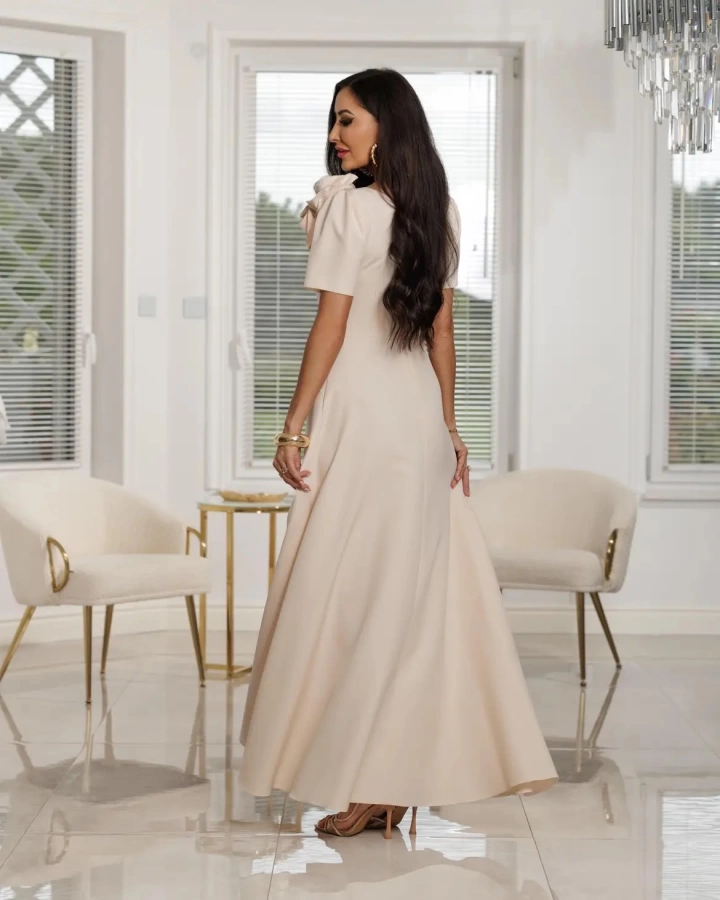 Элегантное вечернее платье в нежном кремово-бежевом оттенке — идеальный выбор для особых мероприятий. Приталенный силуэт мягко подчеркивает фигуру, а изящная роза из ткани на плече добавляет образу романтичную ноту.