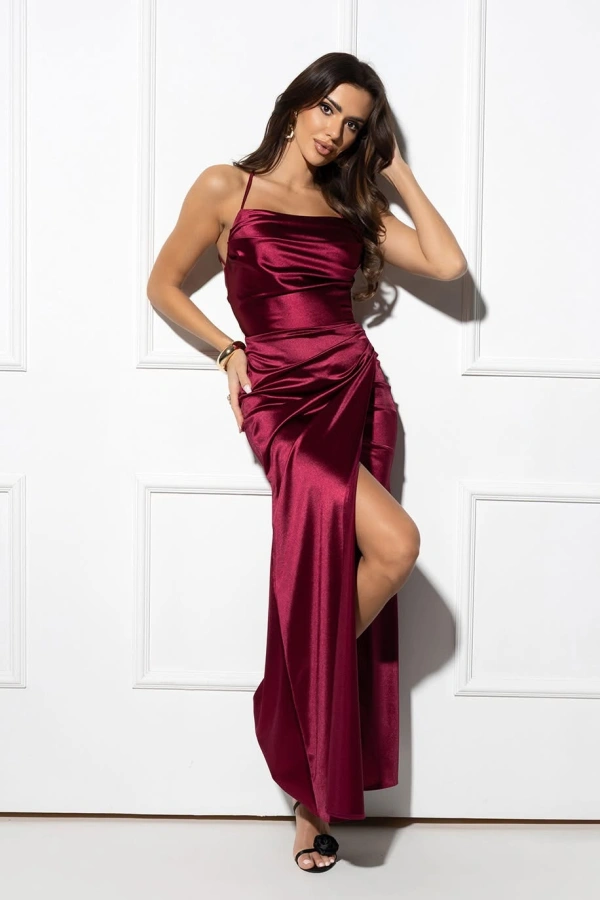 Длинное вечернее платье-рыбка винно-бордового цвета с открытой спиной и шнуровкой — тренд 2026