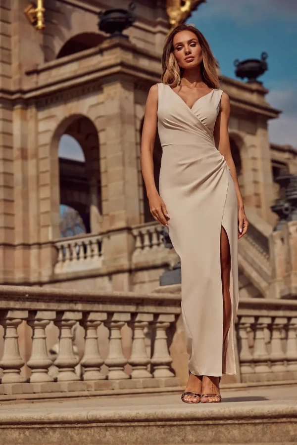 Длинное вечернее платье цвета экрю, которое окутывает вас атмосферой элегантности и утончённой нежности. Разрез по ноге добавляет образу динамики и игривости, а юбочка с запахом наверху разреза обеспечивает комфорт и уверенность в каждом вашем движении. Широкие бретельки подчёркивают линию плеч и придают образу стабильность и уверенность.