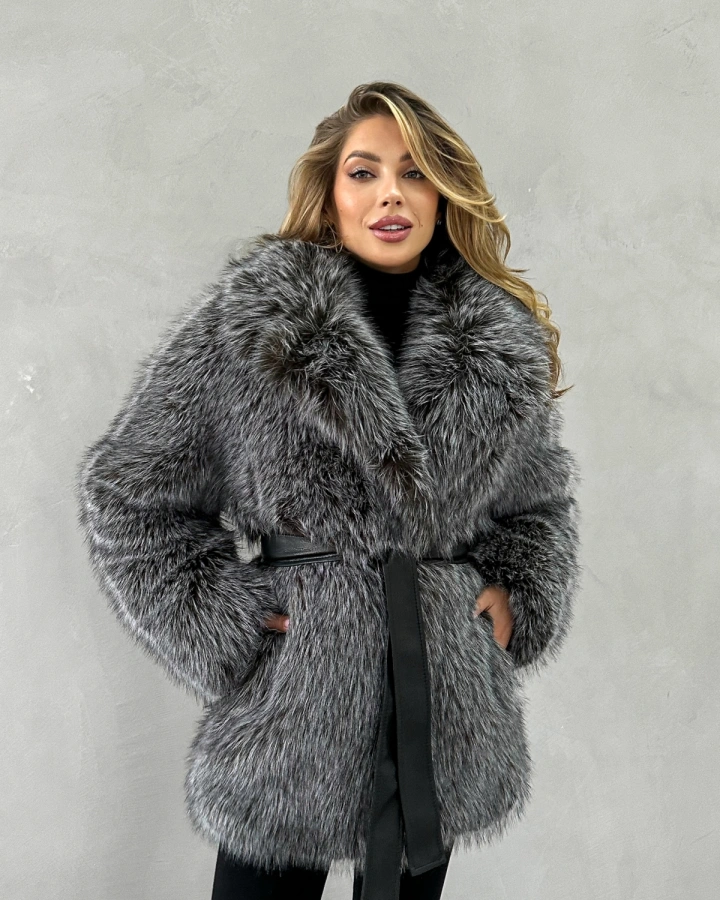 Изысканная короткая шуба длиной до бедер из роскошного экомеха премиум-класса. Натуральный окрас чернобурой лисы с перистым рисунком в бело-серо-черной гамме создает благородный объемный силуэт. Длинноворсная структура меха обеспечивает повышенную теплоизоляцию и невероятно мягкую текстуру. Большой отложной воротник подчеркивает классический крой и придает образу особую элегантность. В комплекте пояс из экокожи для создания акцента на талии.
