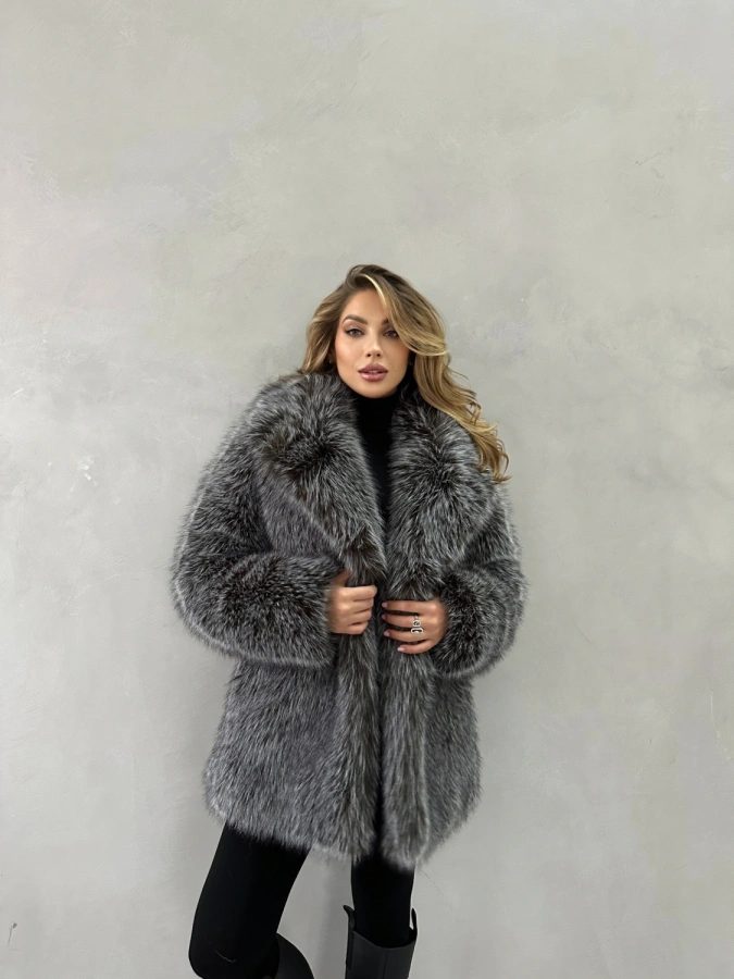 Элегантная укороченная шуба с мехом чернобурой лисы