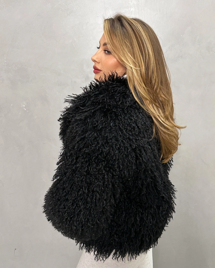 Черный как ночь — ультракороткий полушубок из экомеха с выразительной фактурой ламы. Модель сохранила все преимущества коллекции: утепление натуральной верблюжьей шерстью, удобную для вождения длину и универсальный отложной воротник. Глубокий черный цвет подчеркивает роскошь длинного ворса и делает образ еще более загадочным и дерзким.