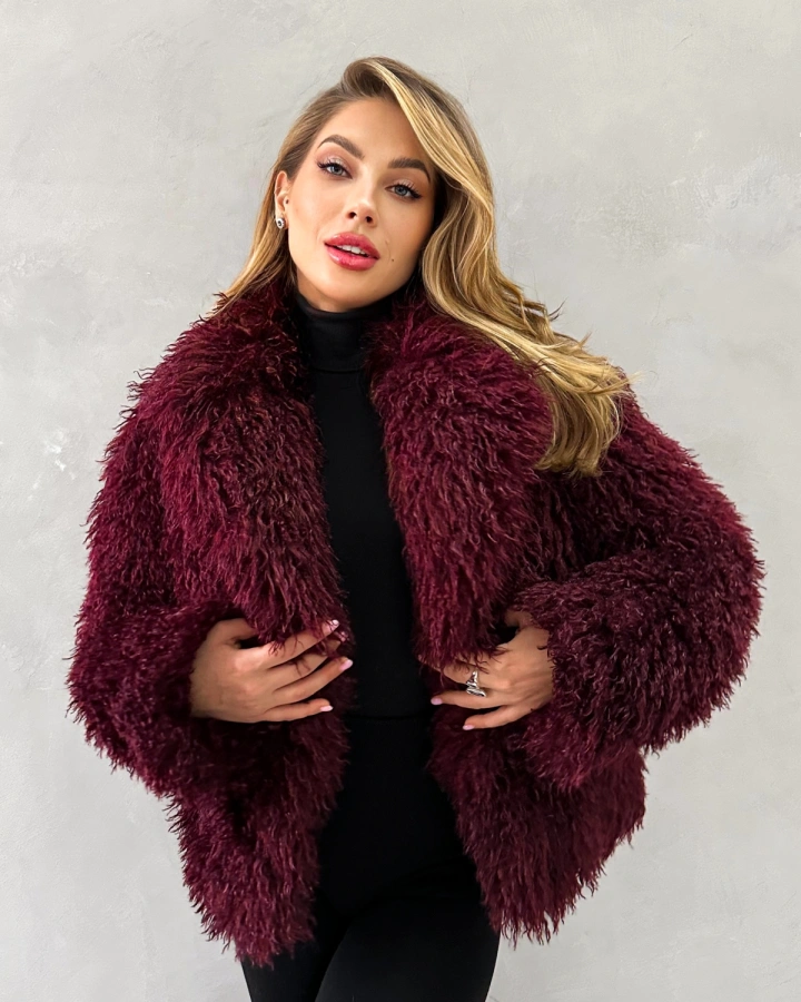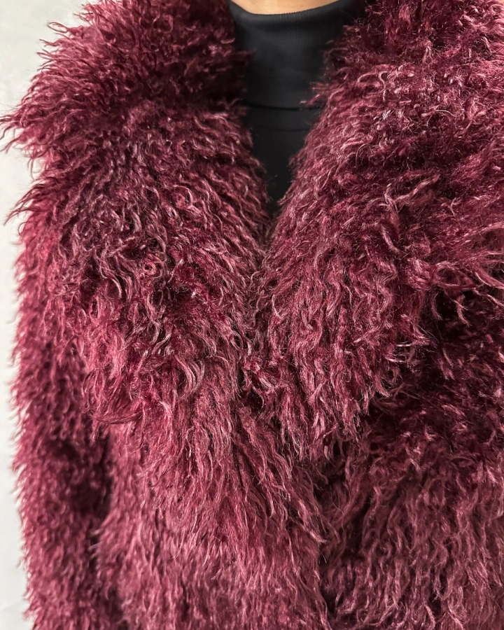 Смелый выбор для современных автоледи — ультракороткий полушубок из бордового экомеха с выразительной фактурой ламы. Как и все модели новой коллекции, он утеплен подкладом из натуральной верблюжьей шерсти, что обеспечивает надежную защиту даже в сильные морозы. Насыщенный оттенок красного вина и длинный лохматый ворс создают образ, который невозможно не заметить. Короткая длина (до линии талии) обеспечивает комфорт при вождении, а универсальный отложной воротник защищает от ветра.