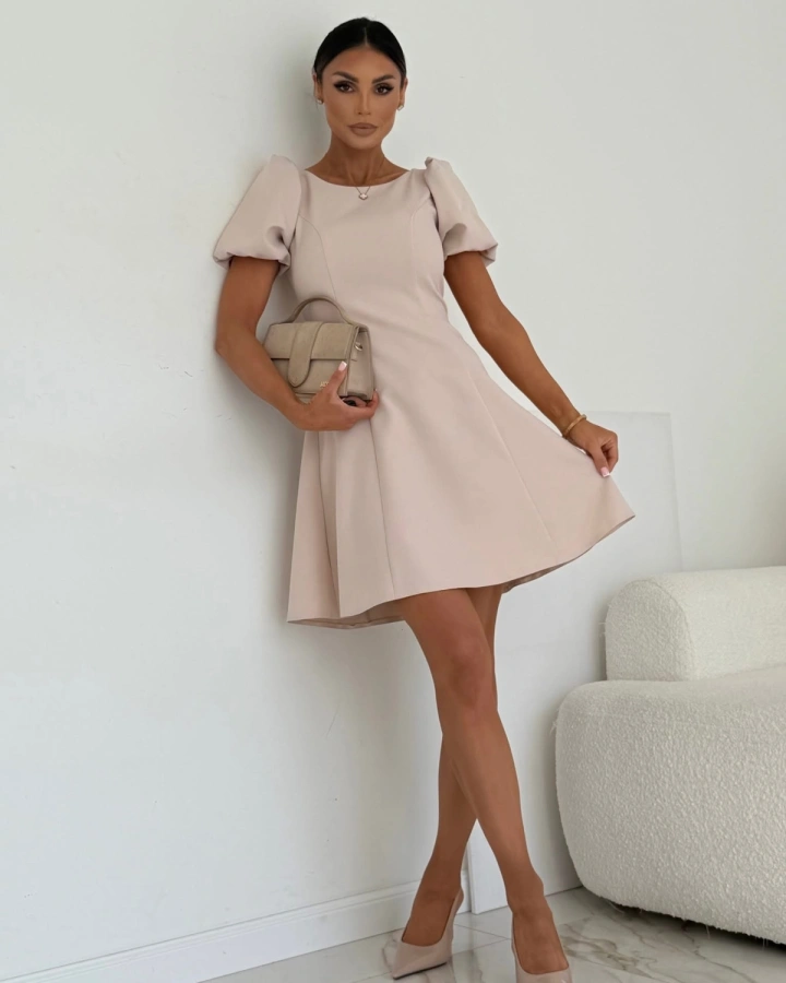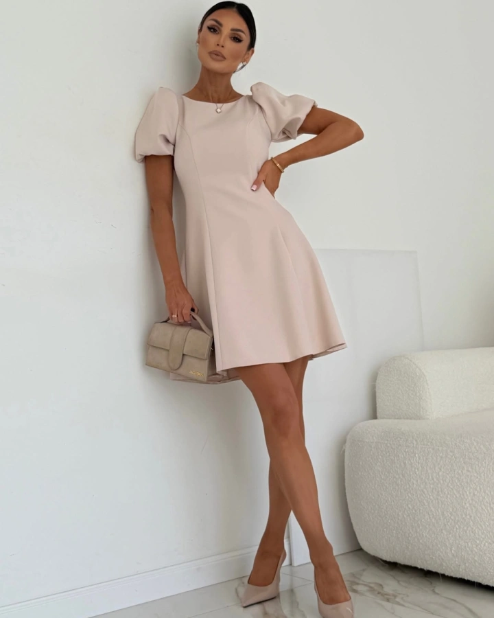 Это короткое ванильно-бежевое платье А-силуэта — элегантный и нежный выбор для любой ситуации. Скромный круглый вырез, закрытые ключицы и спина создают сдержанный и деликатный образ, который подчеркивает естественную красоту и внутреннюю гармонию. Идеально подходит для летнего торжества, выпускного вечера, повседневного образа или свидания.