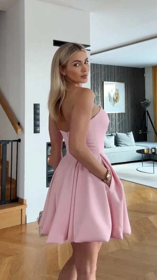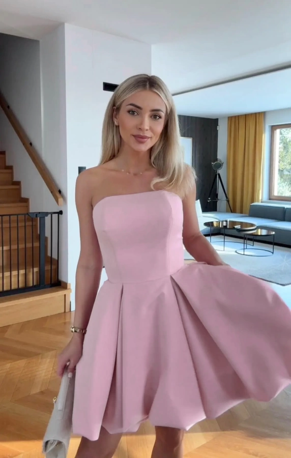 Это короткое пышное вечернее платье — стильный и элегантный выбор для торжественных мероприятий. Верх в виде бюстье без бретелек подчеркивает изящество и женственность, а вшитые поддерживающие косточки обеспечивают идеальную посадку и комфорт. Пышная юбка создает эффектный силуэт, а скрытые карманы добавляют функциональности. Модель идеально подходит для выпускного вечера, свадьбы в качестве гостьи, дня рождения или фотосессии.