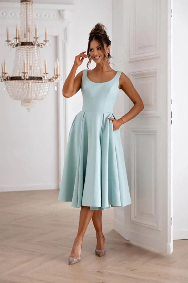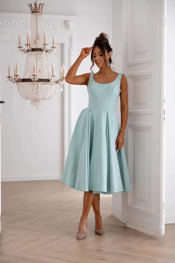 Свежее и женственное платье миди в нежном мятно-зеленом оттенке — идеальный выбор для летних торжеств и особых случаев. Приталенный верх подчеркивает фигуру, а пышная юбка "солнце" создает воздушный, романтичный силуэт, который красиво движется при ходьбе.