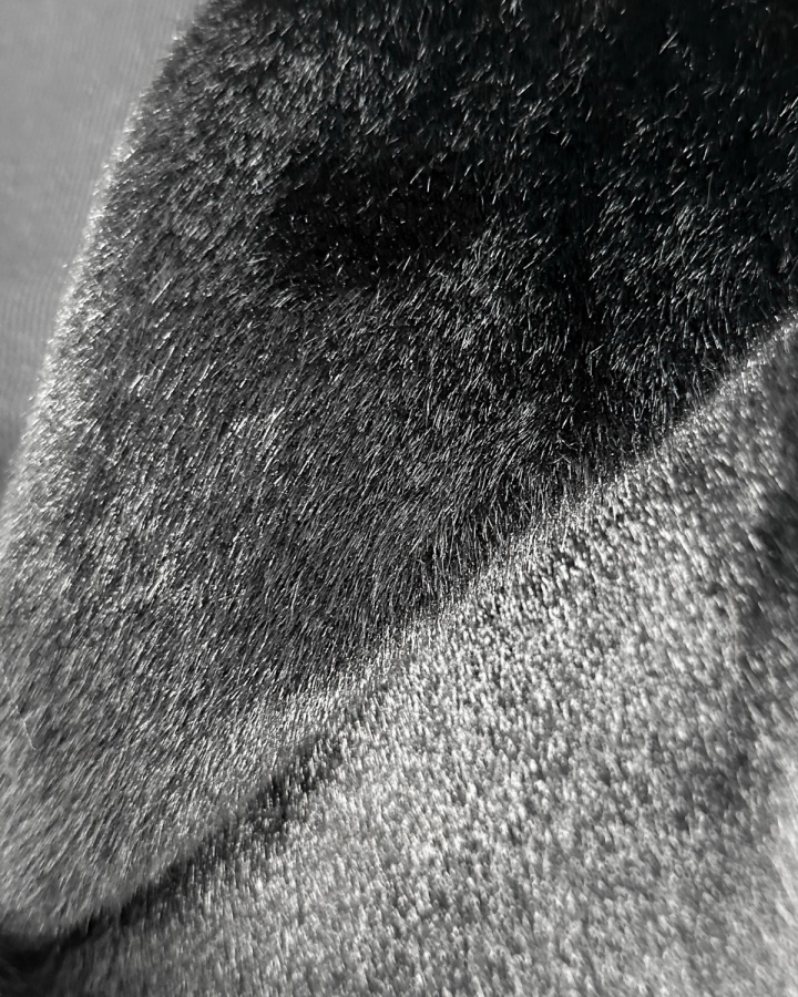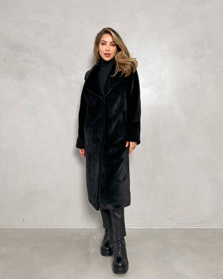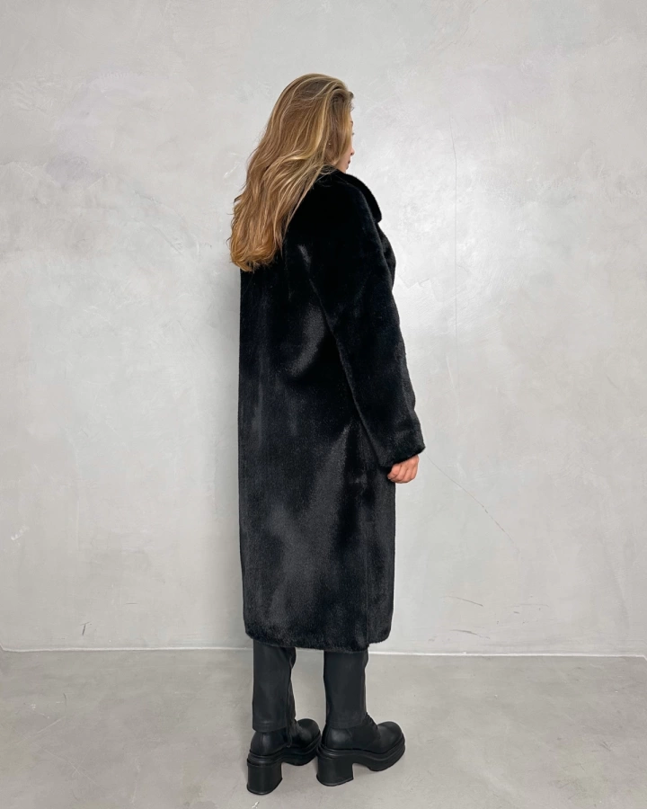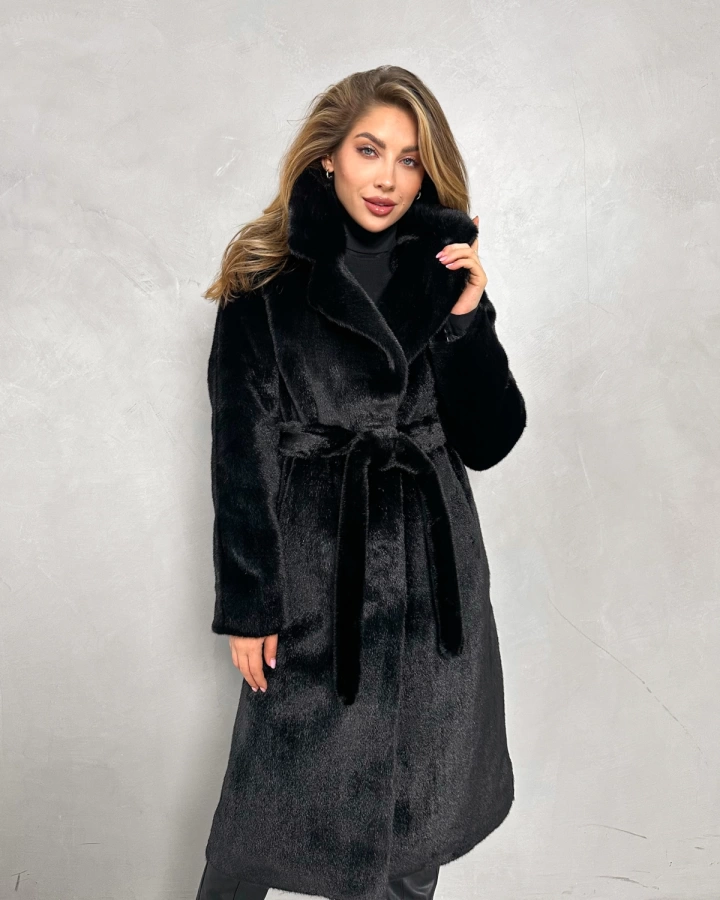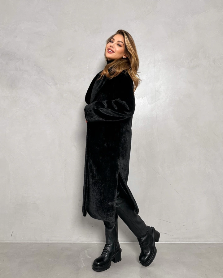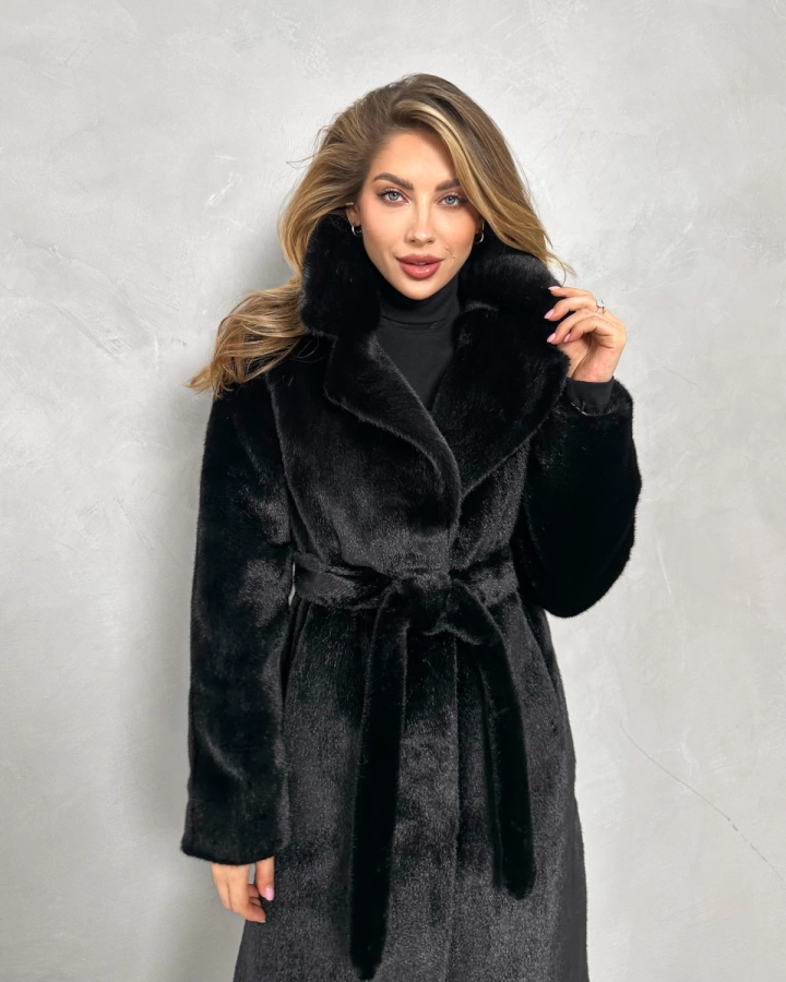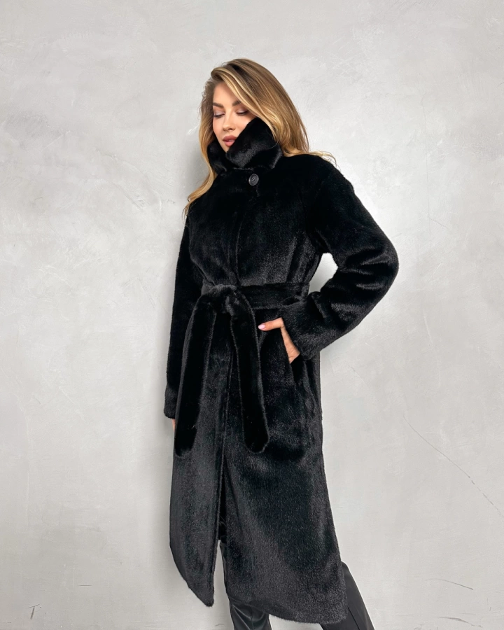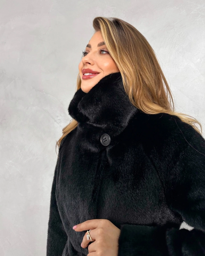 Идеальна для создания стильных городских образов — сочетайте с платьями-миди, юбками-карандаш или узкими брюками. Большой стояче-отложной воротник, фиксирующийся на пуговицу, защитит в ветреную погоду. Пояс подчеркнет талию, усиливая женственный силуэт. Добавьте лаковые аксессуары, чтобы оттенить глубокий черный цвет меха.