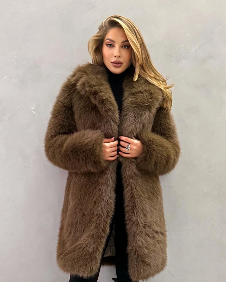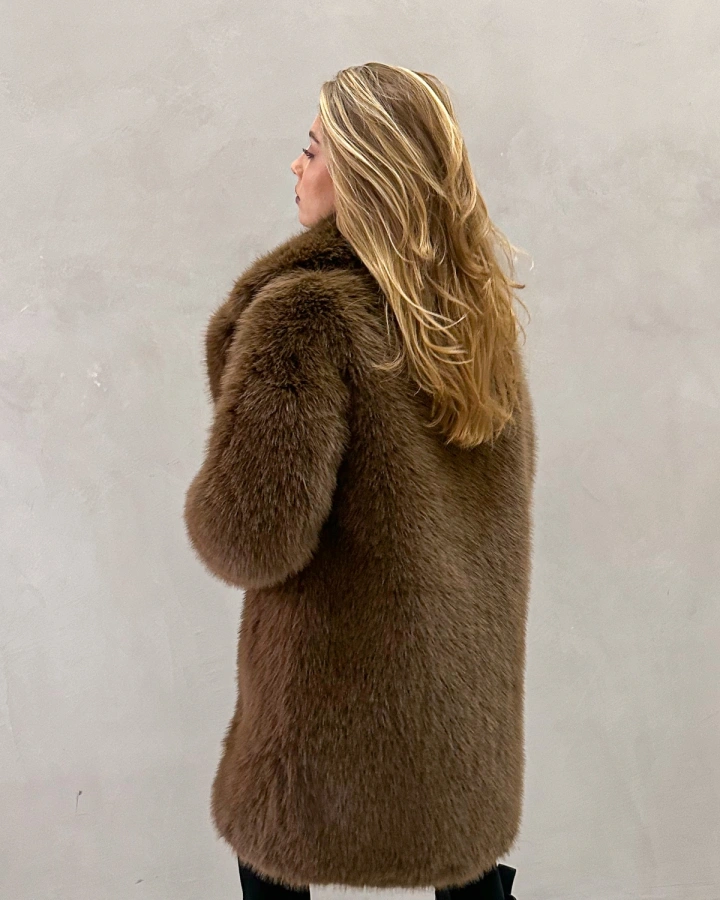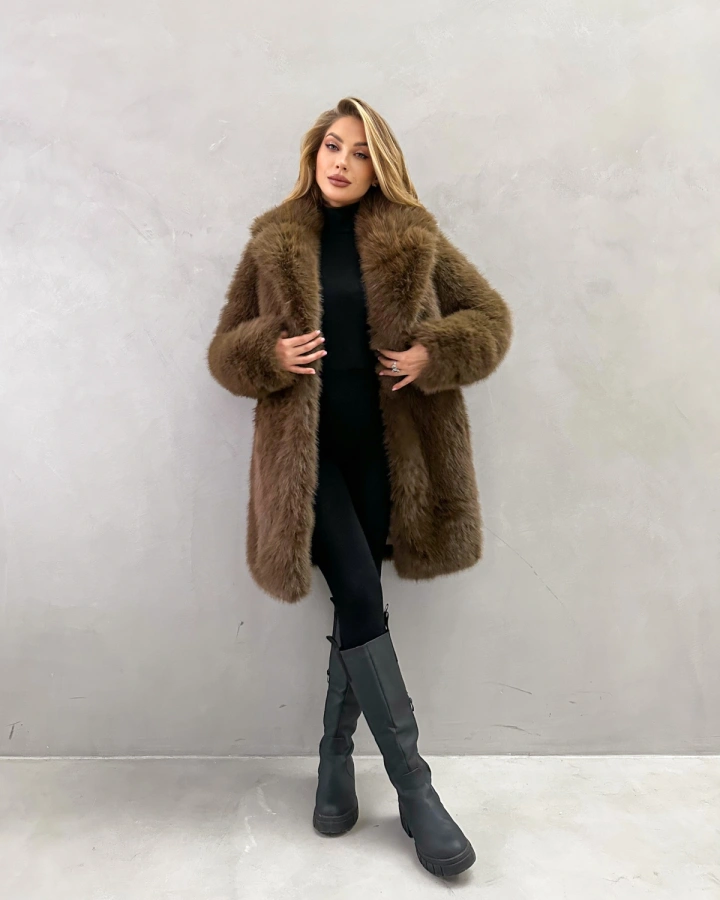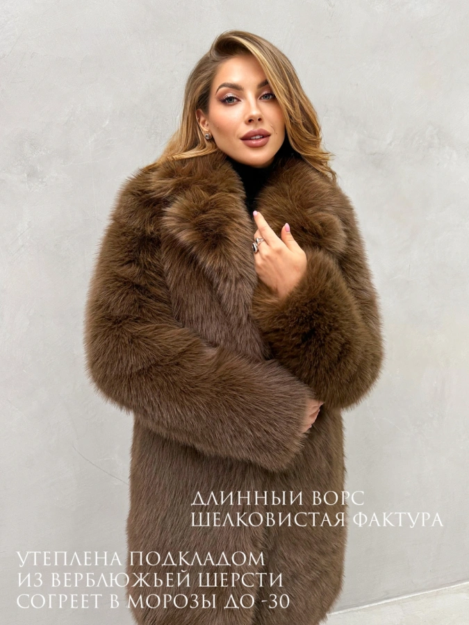 Роскошная шуба-миди из экомеха под коричневого соболя — воплощение элегантности и тепла. Модель классического прямого кроя длиной до колена выполнена из премиального экомеха, точно повторяющего фактуру благородного соболя. Длинноворсный, невероятно пушистый и мягкий мех насыщенного каштаново-шоколадного оттенка создает объемный и эффектный силуэт. В жизни мех выглядит еще более насыщенным и благородным, чем на фотографиях. Благодаря двойному утеплению — самому меху и специальному подкладу — шуба выдерживает морозы до -35°С.