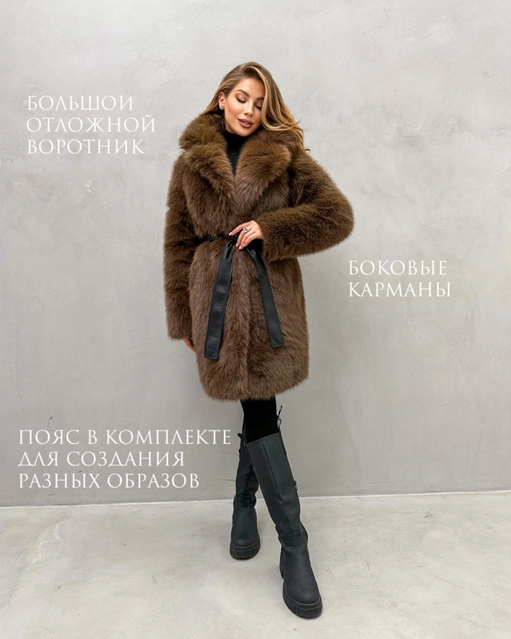 Идеально дополнит как деловой гардероб, так и вечерний выход. Сочетайте с платьями-миди, узкими брюками и сапогами-челси. Пояс из черной эко-кожи позволит подчернуть талию и создать более строгий силуэт. Минималистичные аксессуары в коричневой или черной гамме подчеркнут благородство меха.