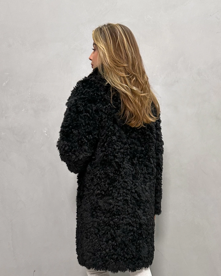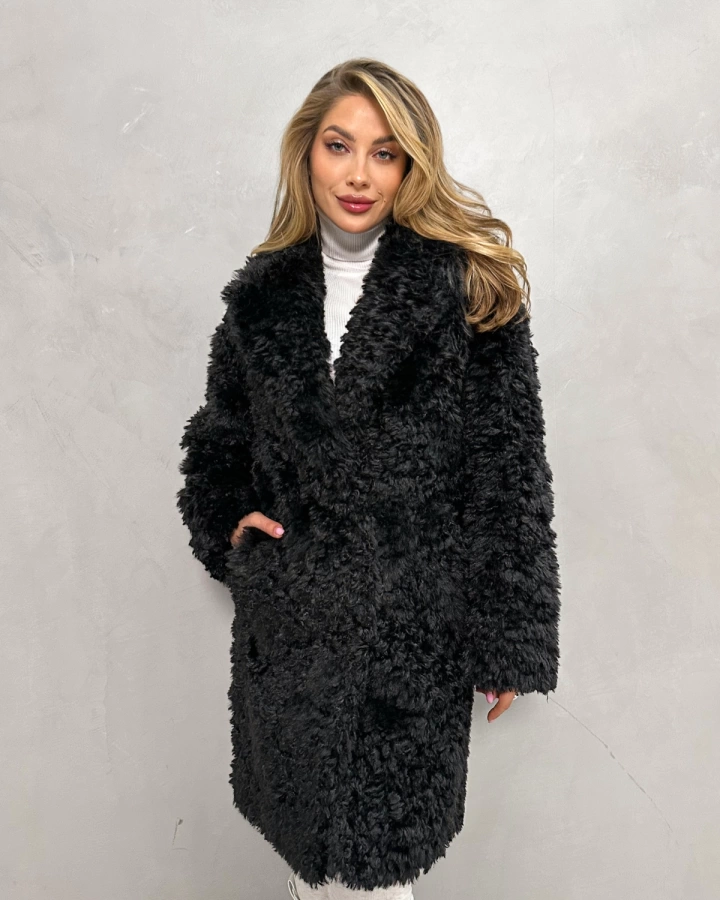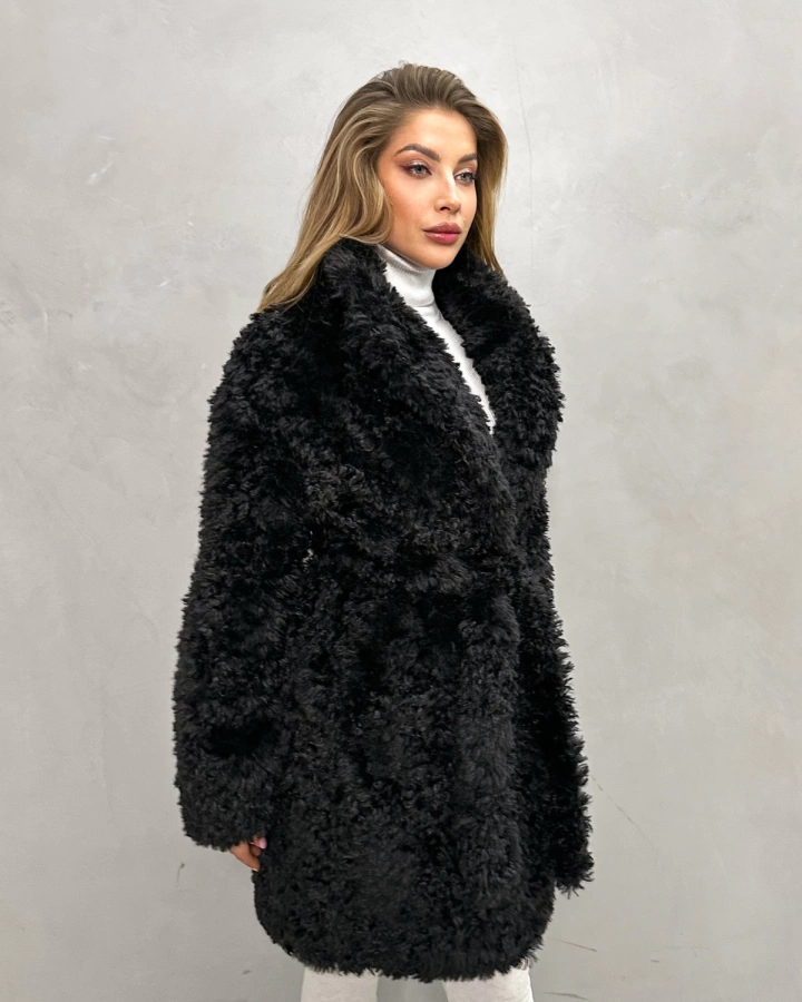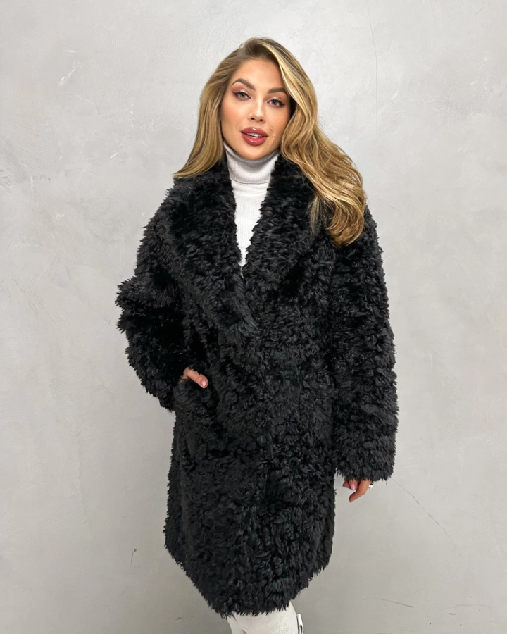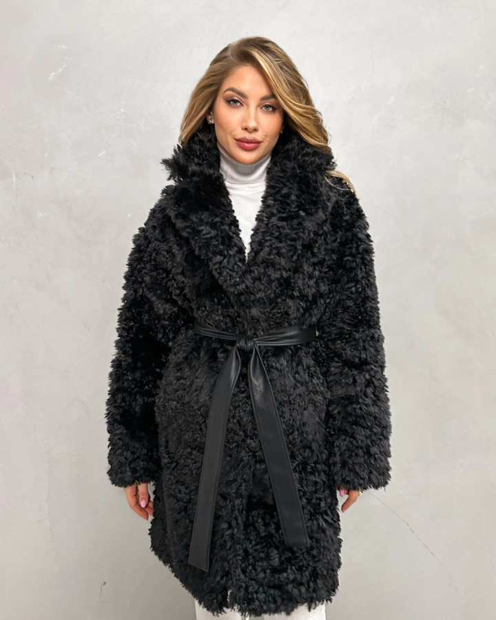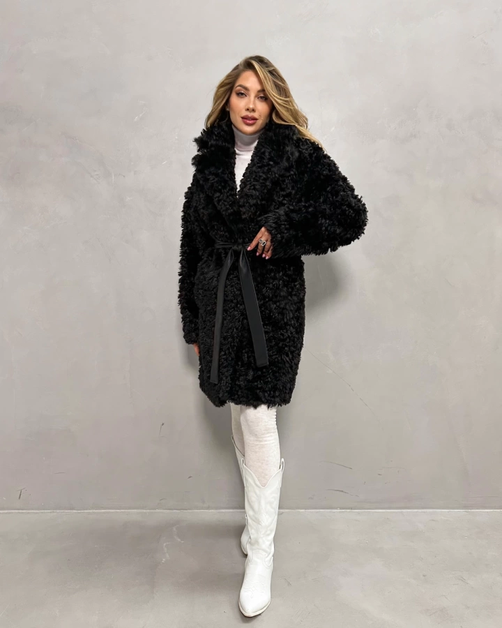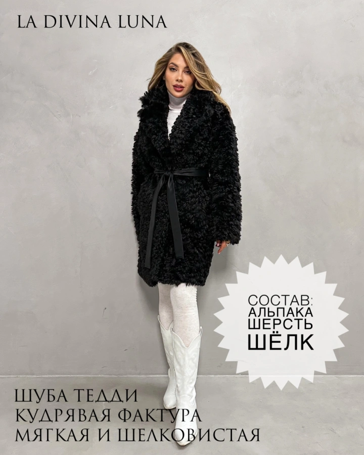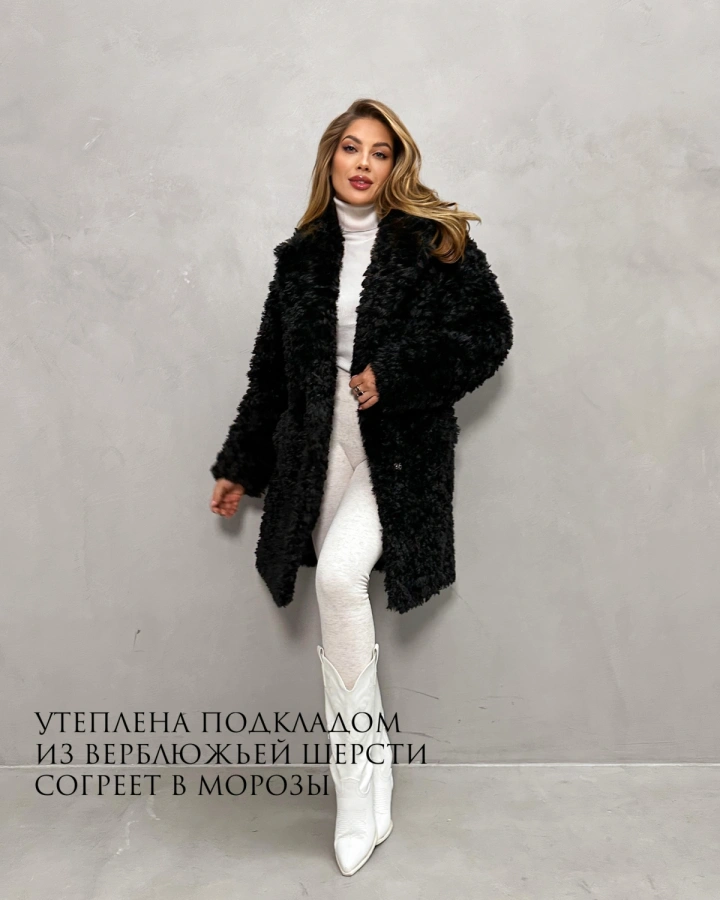 Шуба классического прямого кроя длиной до колена в глубоком черном цвете подчеркивает роскошную фактуру меха «тиградо». Выразительные завитки длинного ворса создают объемный силуэт, сохраняя при этом легкость и комфорт носки. Особенность модели — два пояса в комплекте: из экомеха и экокожи, что позволяет подчеркнуть талию и создавать разные стили. Как и все модели нашей коллекции, шуба утеплена подкладом из верблюжьей шерсти с комфортным температурным режимом до -25°С.