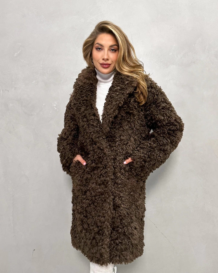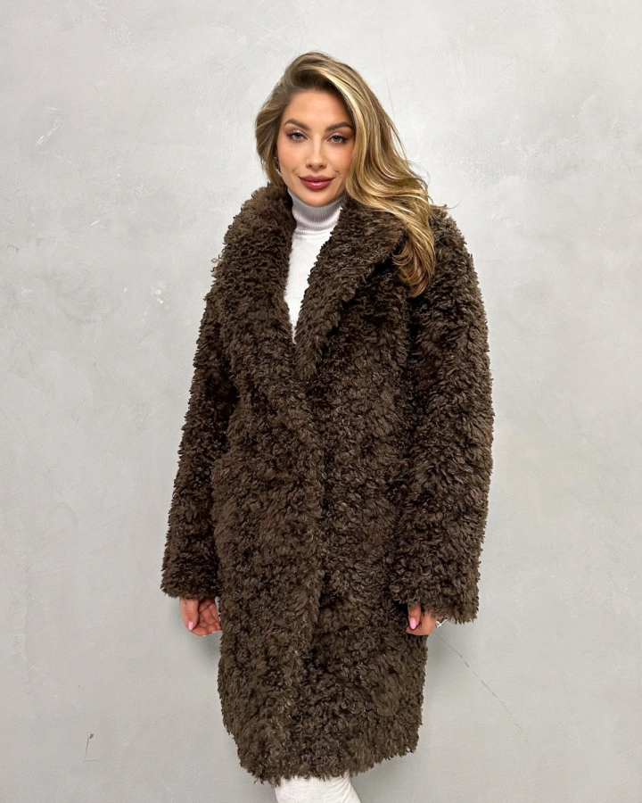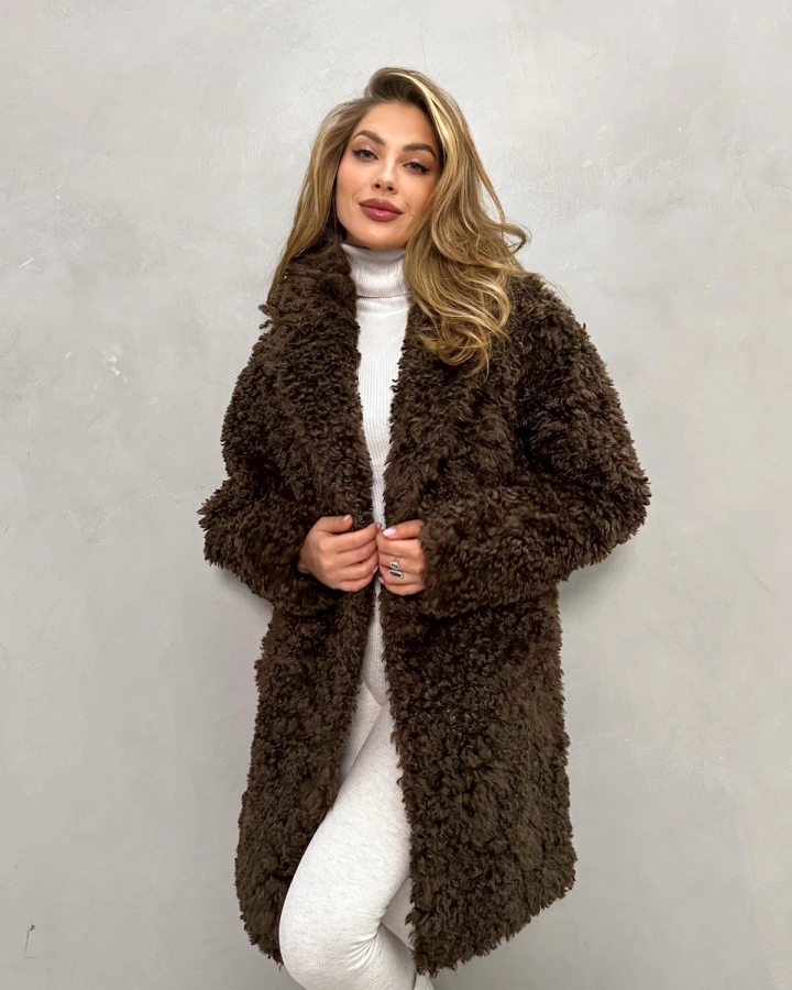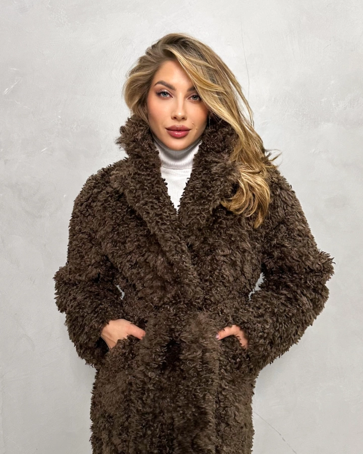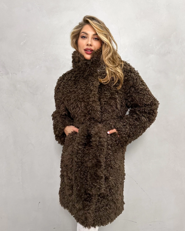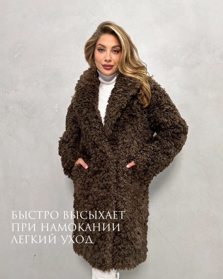 Элегантная шуба с кудрявым мехом в теплых тонах