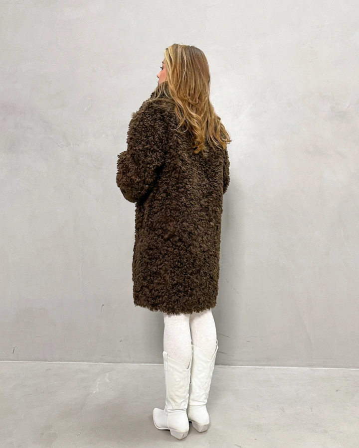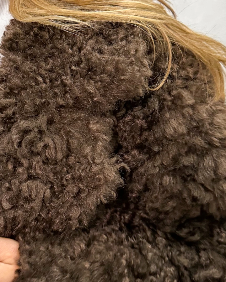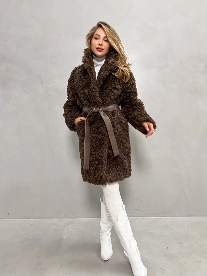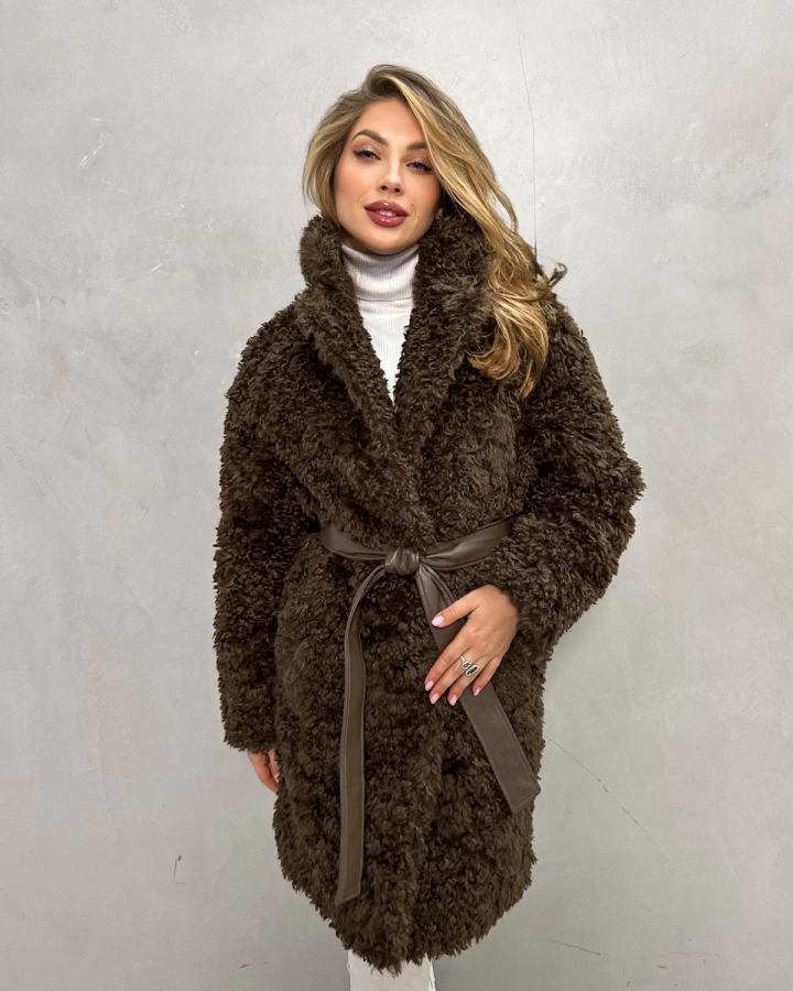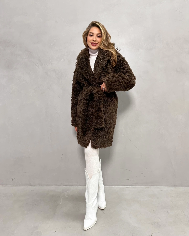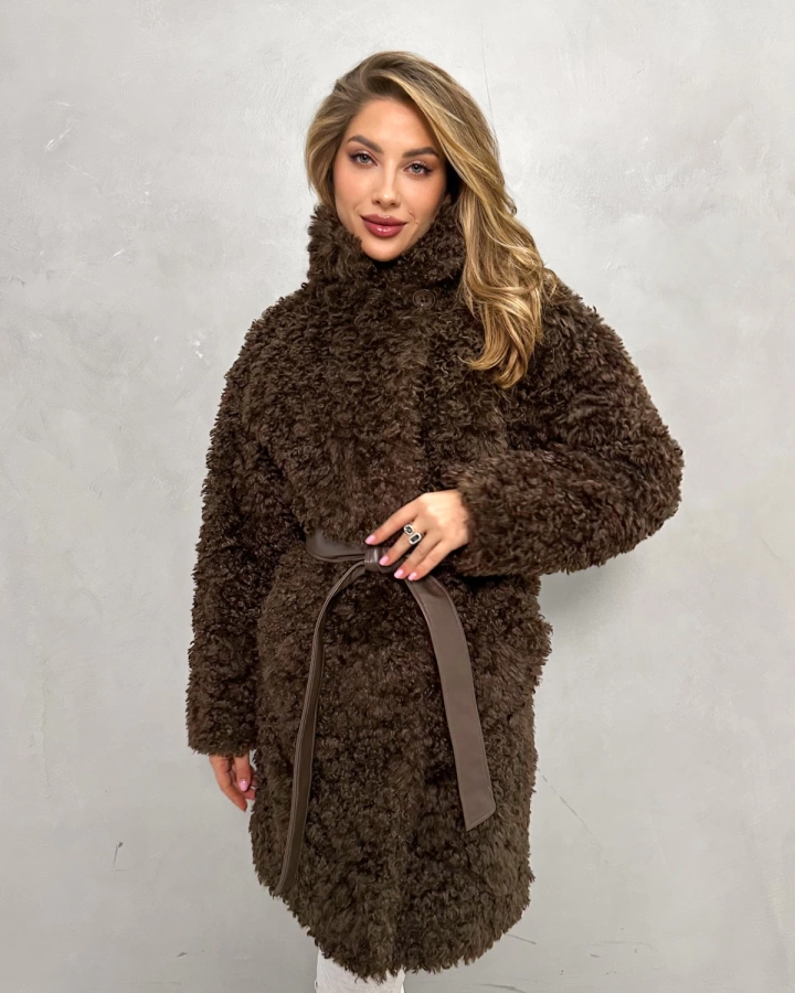 Элегантная шуба с кудрявым мехом в теплых тонах