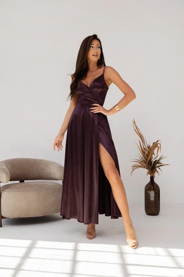 Это элегантное платье в насыщенном оттенке темного шоколада с легкой фиолетовой нотой — воплощение сдержанной роскоши и глубины. V-образное декольте на запах и расклешенная юбка создают гармоничный силуэт, идеальный для торжественных мероприятий. Модель соответствует актуальным трендам вечерних платьев 2026 и идеально подходит для выпускного вечера, свадьбы в качестве гостьи, вечернего приема или романтического ужина.